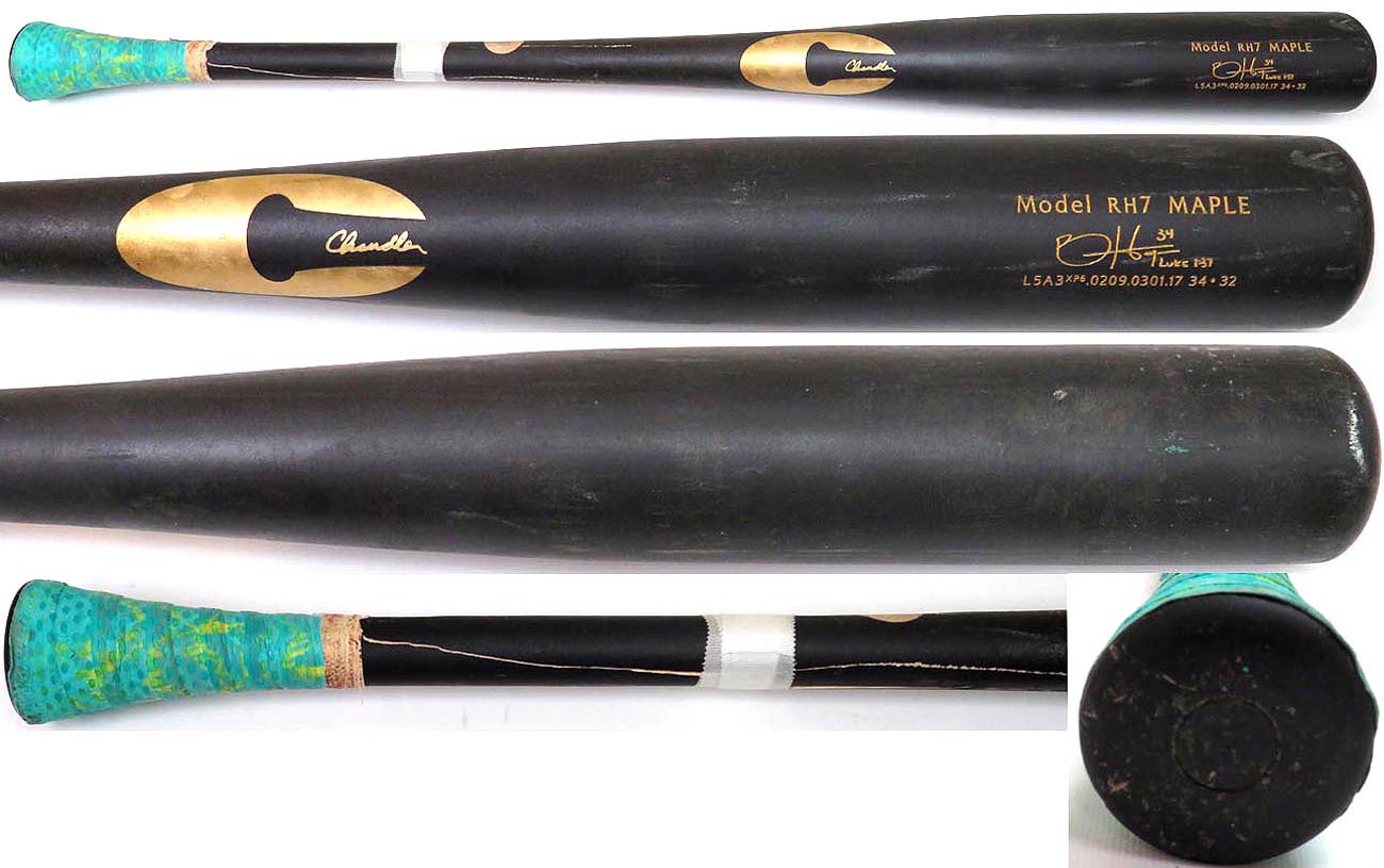 Chandler model RH7, from the 2017 season, exhibits evidence of excellent use with a handle crack. Several ball marks and ball stitch impressions are visible on the right, left and back barrel. Ball marks include blue ink transfers. Also visible on the bat are blue bat rack streaks and an impression from a weighted batting donut. The handle and knob have been taped to enhance the grip. The length and weight (34-32) are stamped on the front barrel. The bat has been graded a PSA GU8.5. A great bat of the All Star 1st baseman!