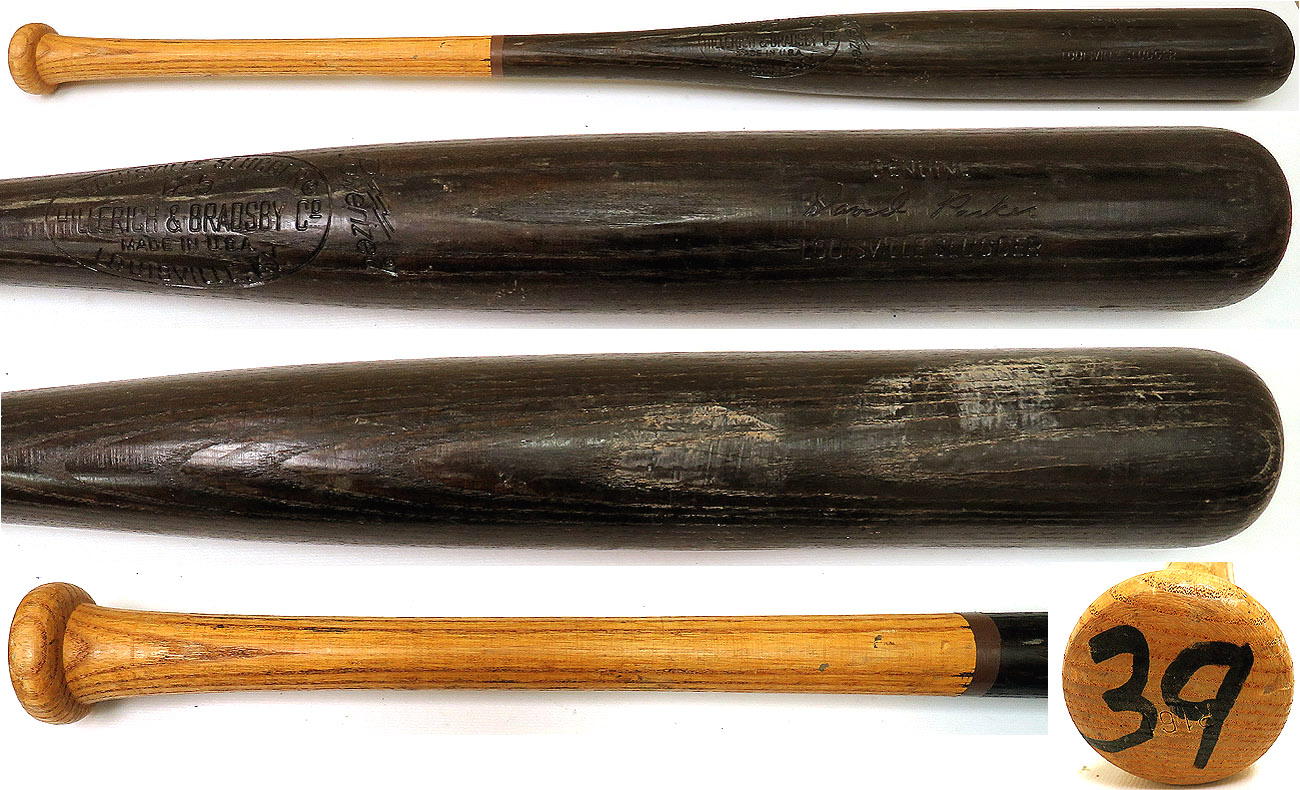 Hillerich & Bradsby model R161, circa 1974-1975, exhibits evidence of excellent use with a handle crack. Several ball marks and ball stitch impressions are visible on the right, left and back barrel. Ball marks include white leather scuffs. There is a light coat of pine tar on the handle. The model number (R161) is stamped into the knob and Parker’s number (39) is written on the knob in black marker. The bat has been graded a PSA GU9.5. A great bat of the Hall of Fame right-fielder!