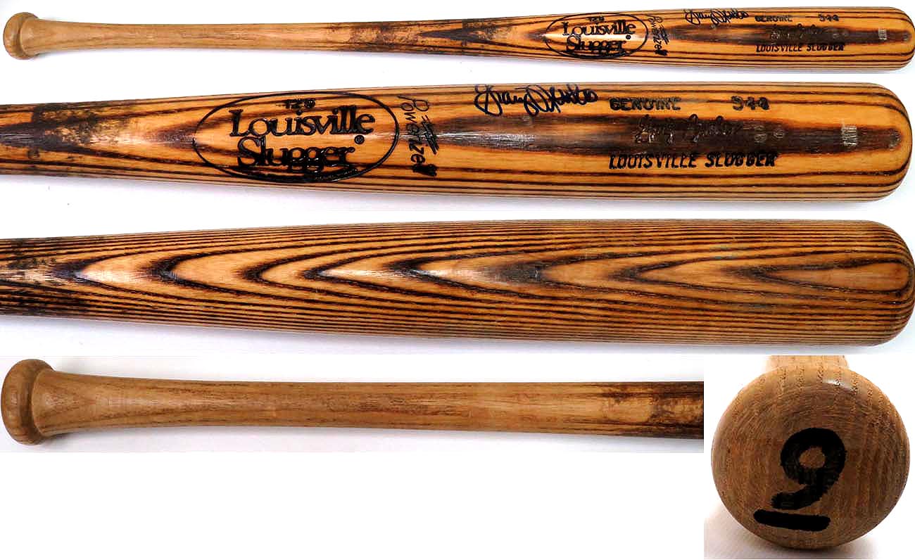Louisville Slugger model S44, circa 1983-1986, is un-cracked and exhibits evidence of excellent use. Several ball marks and ball stitch impressions are visible on the left and back barrel. Ball marks include white leather scuffs. There is a moderate coat of pine tar on the upper handle. Nettles’ number (9) is written on the knob in black marker. A Graig Nettles signature is on the left barrel in blue marker. The bat has been graded a PSA GU9.5. A great bat of the All Star 3rd baseman!
