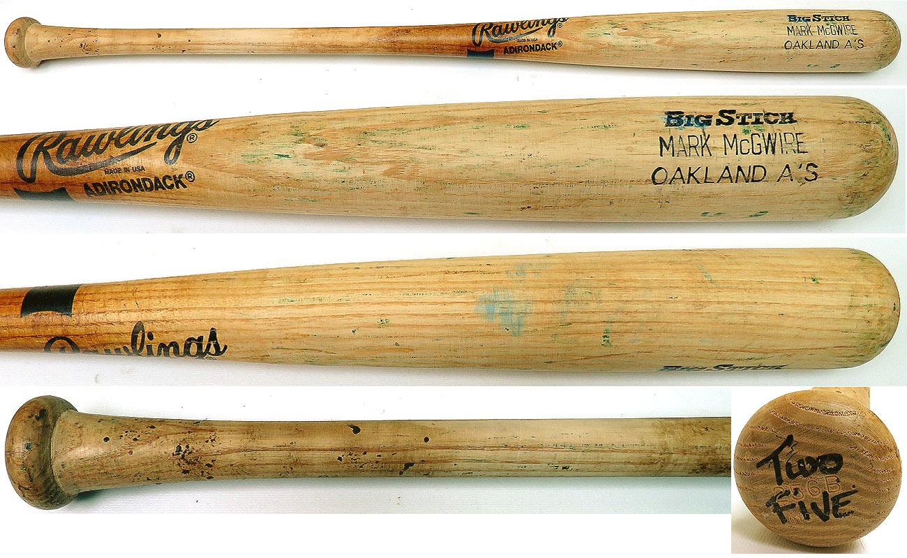 Rawlings/Adirondack model 256B, from the 1994 season, exhibits evidence of outstanding use with a handle crack that has been repaired. Many ball marks and ball stitch impressions are visible on the left, front and back barrel. Ball marks include blue ink transfers. Also visible on the bat are green bat rack streaks. There is a moderate coat of pine tar on the lower handle and a light coat on the Rawlings center brand. The model number (256B), order number (019) and year (94) are stamped into the knob. The weight “33” and “McGwire” are written on the knob in ball point pen. McGwire’s number “Two Five” is written on the knob in black marker. The bat has been graded a PSA GU9.5. A great A’s bat of the All Star 1st baseman!