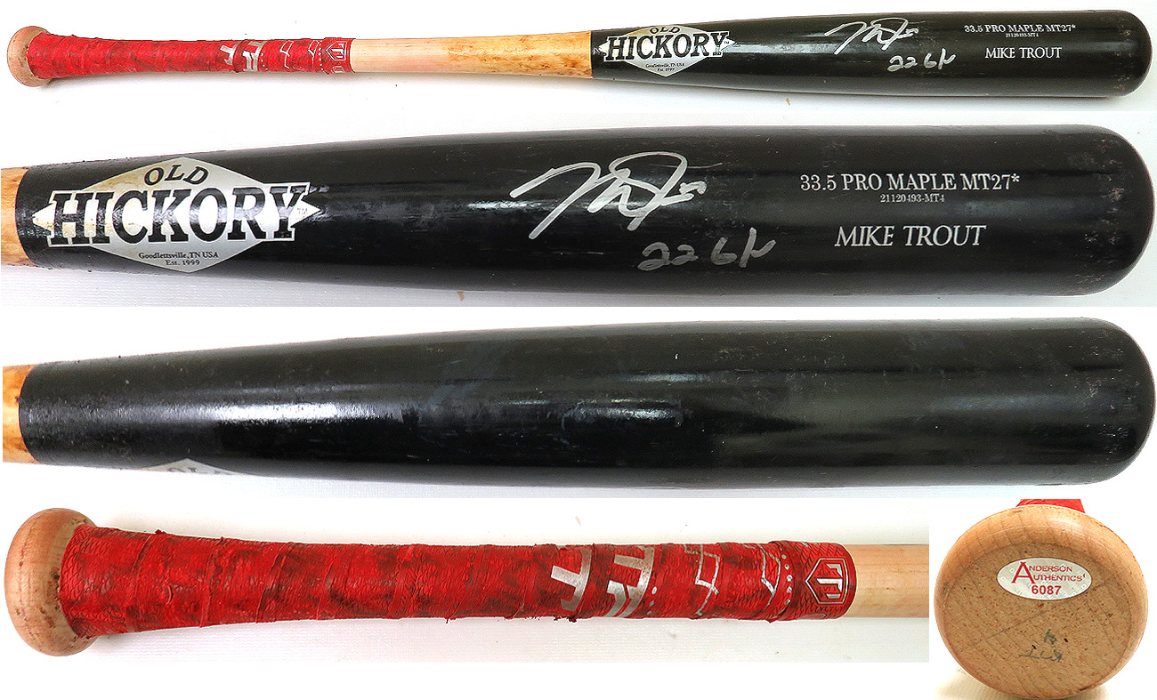 Old Hickory model MT27*, from the 2022 season, is un-cracked and exhibits evidence of excellent use. Several ball marks and ball stitch impressions are visible on the right, left and back barrel. Ball marks include blue ink transfers. The handle has been taped approximately 10″ in a spiral pattern with Lizard Skins tape to enhance the grip. There is a moderate coat of pine tar on the upper handle. The length (33.5) is stamped on the front barrel. A Mike Trout signature and the added inscription “22 G/U” are on the front barrel in silver marker. An Anderson Authentics hologram (6087) is affixed to the knob. The bat has been identified with Trout at the plate on July 3rd, 2022. The bat has been graded a PSA GU10. A great bat of the All Star centerfielder!